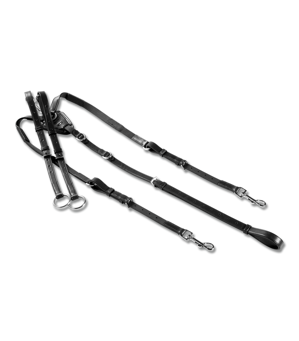 Made of high quality leather. With stainless steel buckles, elastic insert at the neck and detachable martingale forks.
