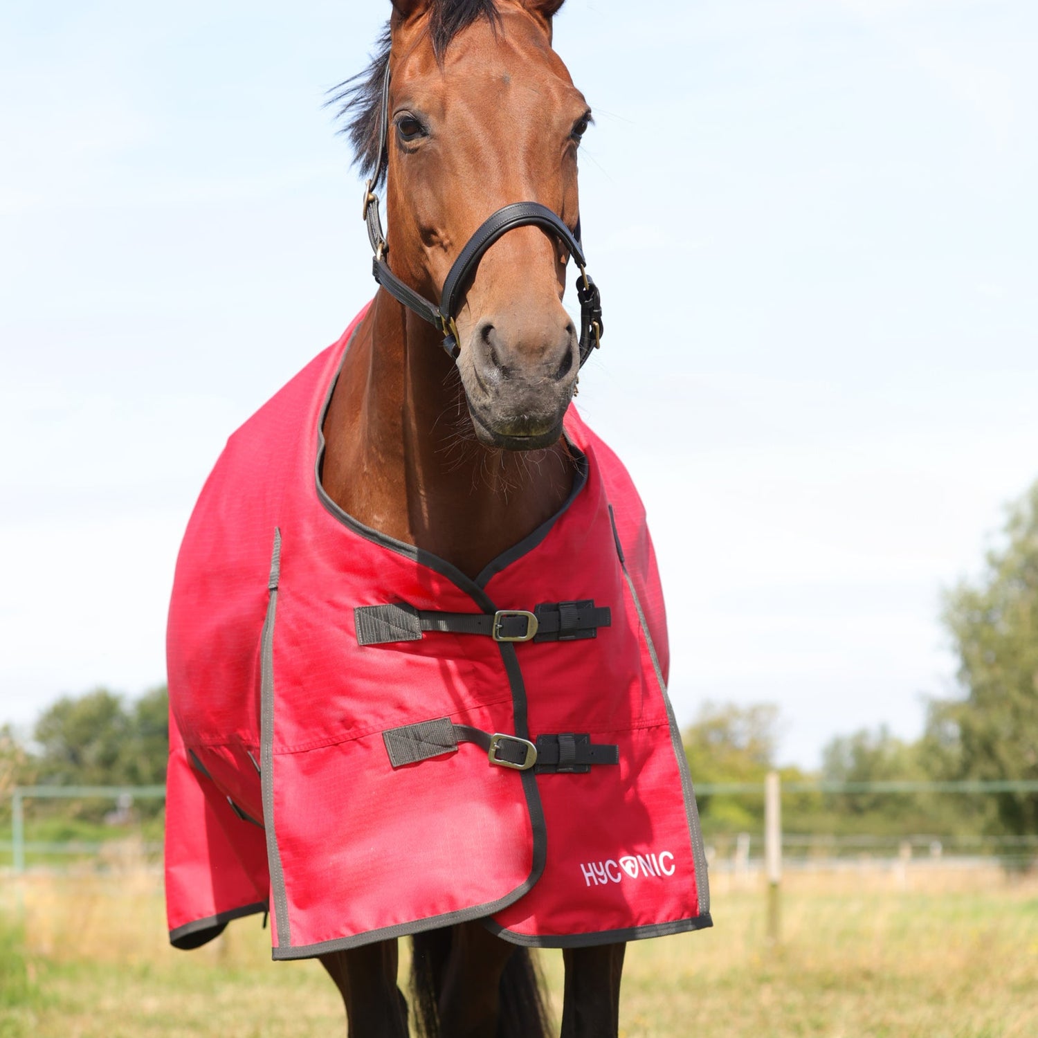 A super medium weight turnout with 200g fill, this red waterproof 600 denier rug is perfect to use when a thicker layer is needed when the weather turns inclement. Featuring charcoal cross surcingle’s, twin buckle chest fastenings and fillet string to keep the rug securely in place. With generous tail flap for extra protection and shoulder gusset for freedom of movement. Finished with printed HyCONIC logo.