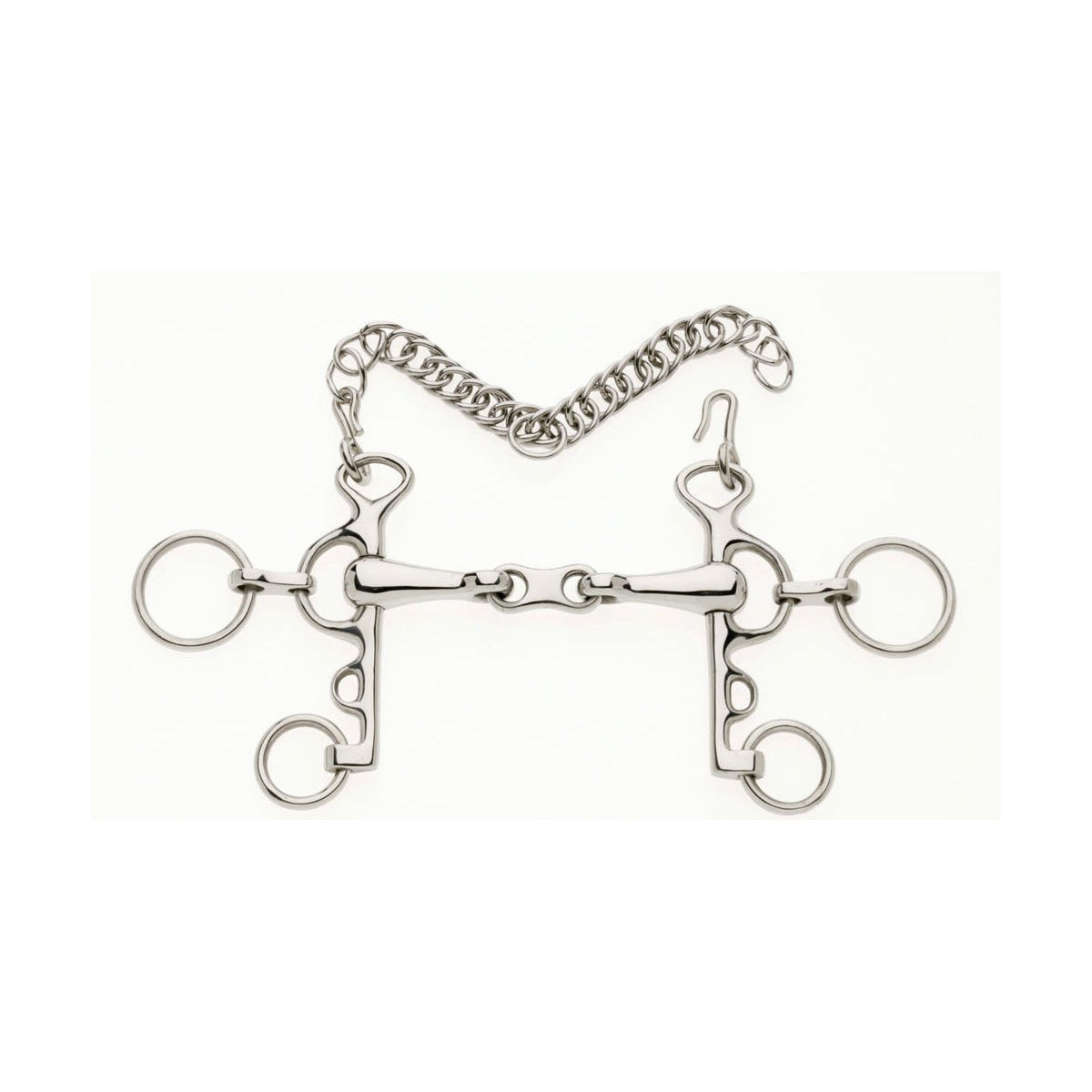 French link mouthpiece relives the nutcracker action and prevents palate pressure. Designed to be used with two reins.