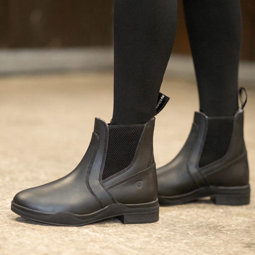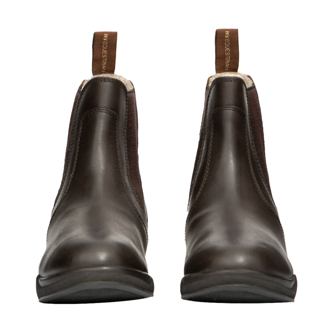 HyLAND Fleece Lined Wax Leather Jodhpur Boot; A hard wearing, comfortable, everyday riding and yard boot with cushioned insole and steel shank to give maximum ankle support. Constructed using waxed water resistant leather combined with a hard wearing TPR sole. A practical pull on boot with elasticated side gussets. All HyLAND boots come with easy to display packaging to help create an eye-catching retail display.