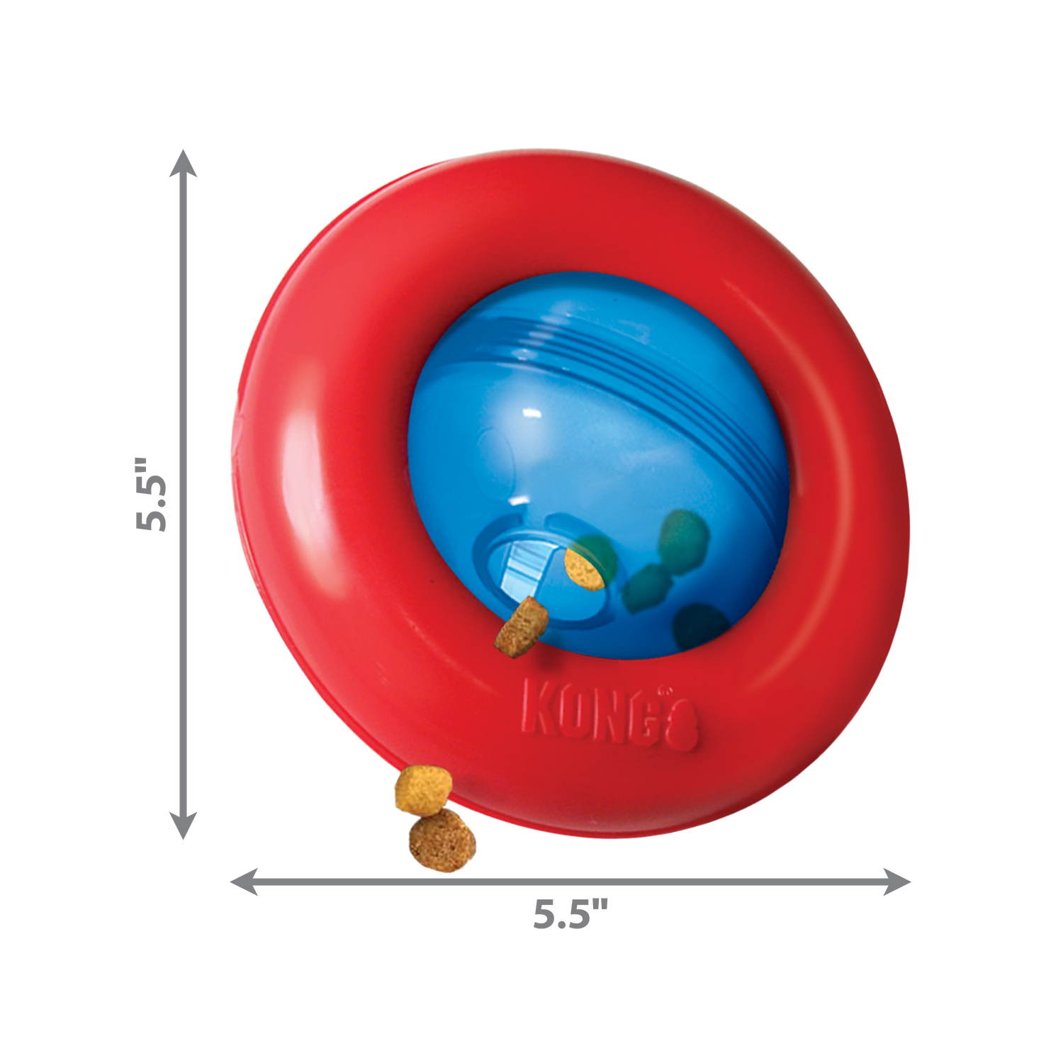 The KONG Gyro is sure to entertain with irresistible roll and flip action keeping dogs enticed and intrigued. With the centre spinning orb and static outer ring, this dynamic toy encourages dogs to push, paw and roll the GYRO, delightfully dispensing tasty treat rewards along the way. Ideal for independent play, stuff with snacks or kibble for added fun and extended playtime. Available in large and small sizes.