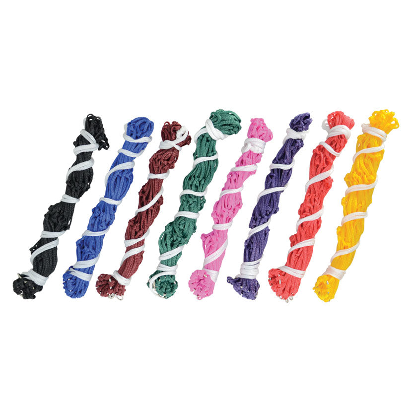 Polypropylene mesh hay net with rings at the top and bottom. Comes with Large holes.