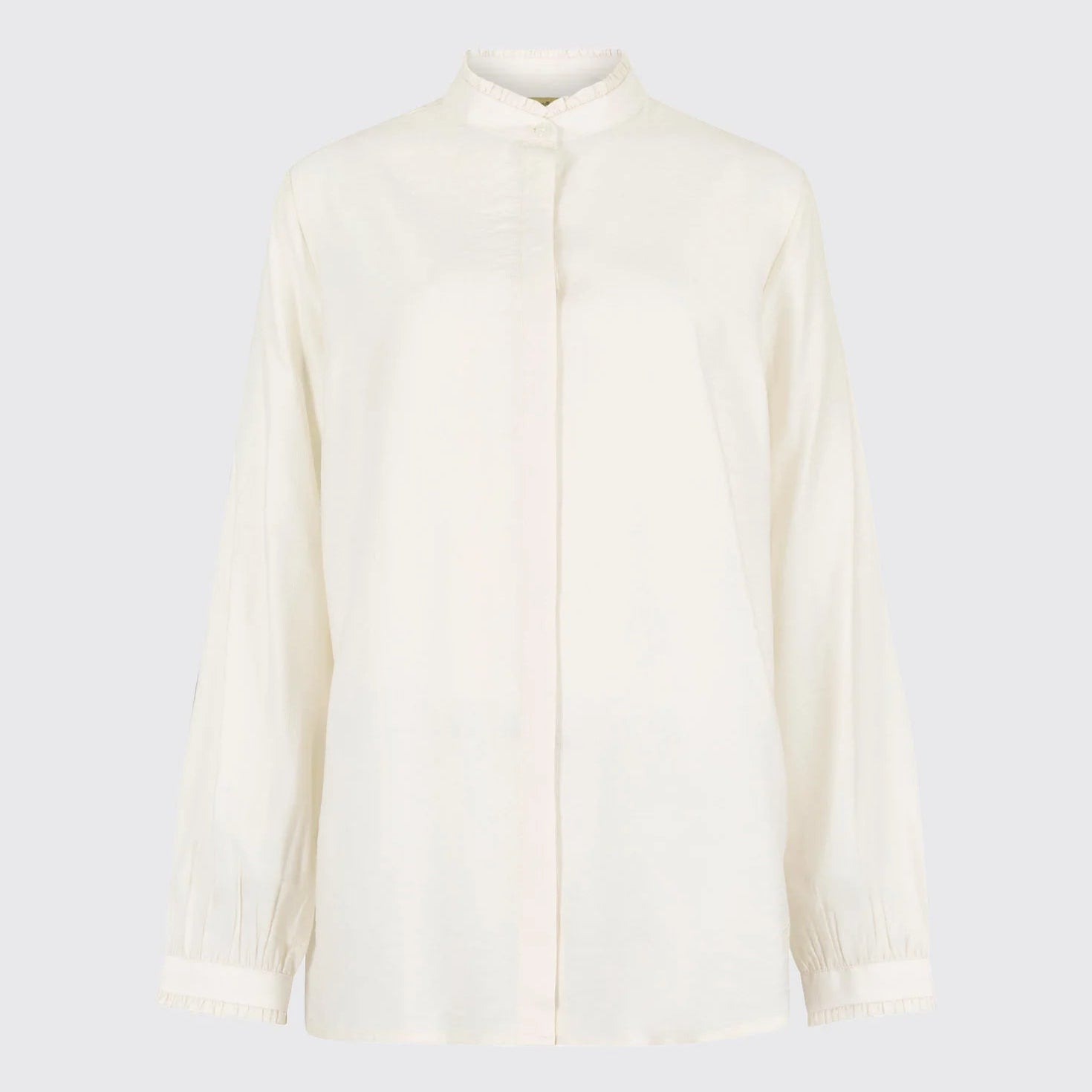 A beautifully light blouse with a dainty ruffle edged collar and cuffs will give your outfit a real touch of sophistication. Its longer length and rayon blend fabric mean it will flatter and fit most body types and can be worn over waistbands or tucked in thanks to its light weight. Stunning under tailored jackets but equally eye-catching paired with a knit.