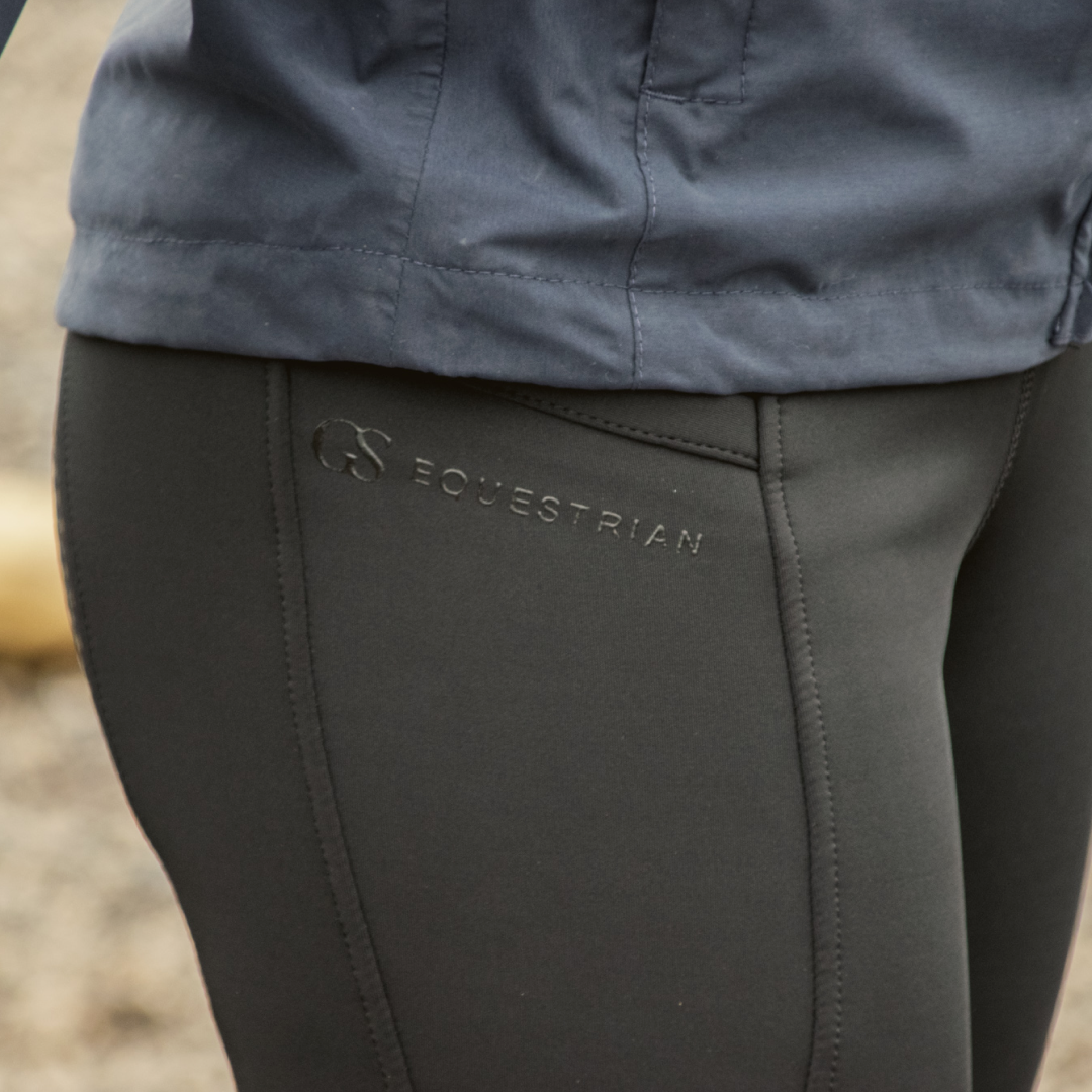 There are two sizeable pockets, one located on each leg, which can easily fit a phone as well as other personal possessions. A feature is made out of the pockets by edging them with stitching as well as having a silicone GS Equestrian logo on the right phone pocket.