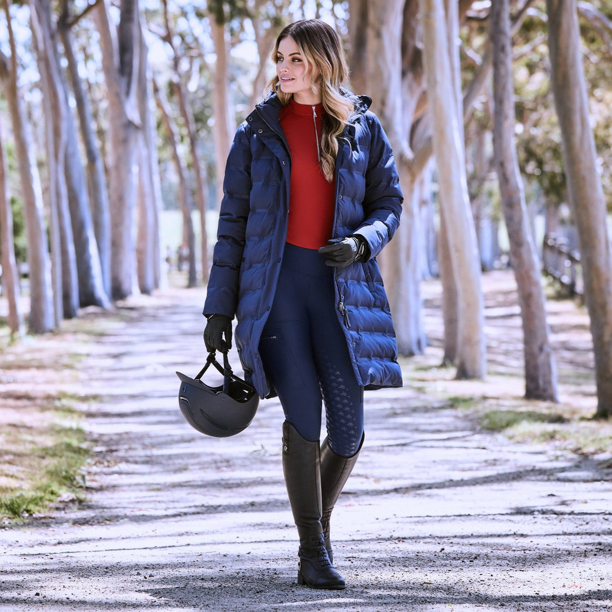 Seal in the warmth with the stylish WeatherBeeta Helsinki Heat Seal Quilted Jacket! Designed with comfort in mind this long line winter coat is sure to keep you warm at the yard this winter. The showerproof outer will protect you in the unexpected showers, whilst the heat seal quilted design remains stylish, ribbed storm cuffs and wadding fill add extra protection keeping you cosy all day long. Featuring a removable hood, with toggles and drawcord, for versatility. Two side pockets with press stud closure are ideal for keeping your hands warm when teaching! With a two way front zip closure and rear gusset with press stud closure allow for freedom of movement when walking or in the saddle. This winter coat comes in Navy and available in Ladies XS - XL.