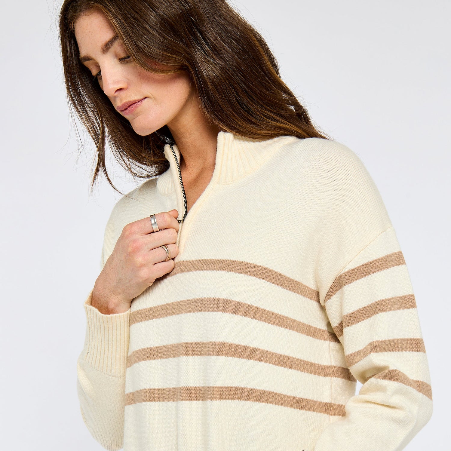 The Dubarry Fonthtill sweater is lightweight and wonderfully soft, made with a combination yarn designed to be soft to the touch, hold its shape well and be machine washable. The crisp contrasting stripes have a distinct nautical feel, very at home by the sea, but bring a fresh spring touch wherever you take it. The ribbed collar can be zipped up or down giving you a light spring layer that’s also cosy on cooler spring evenings.