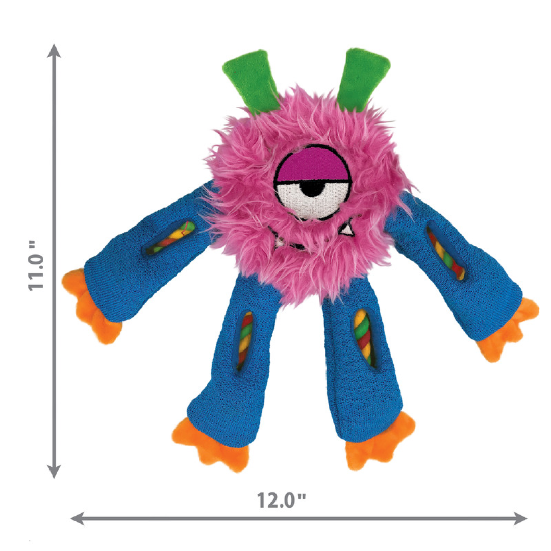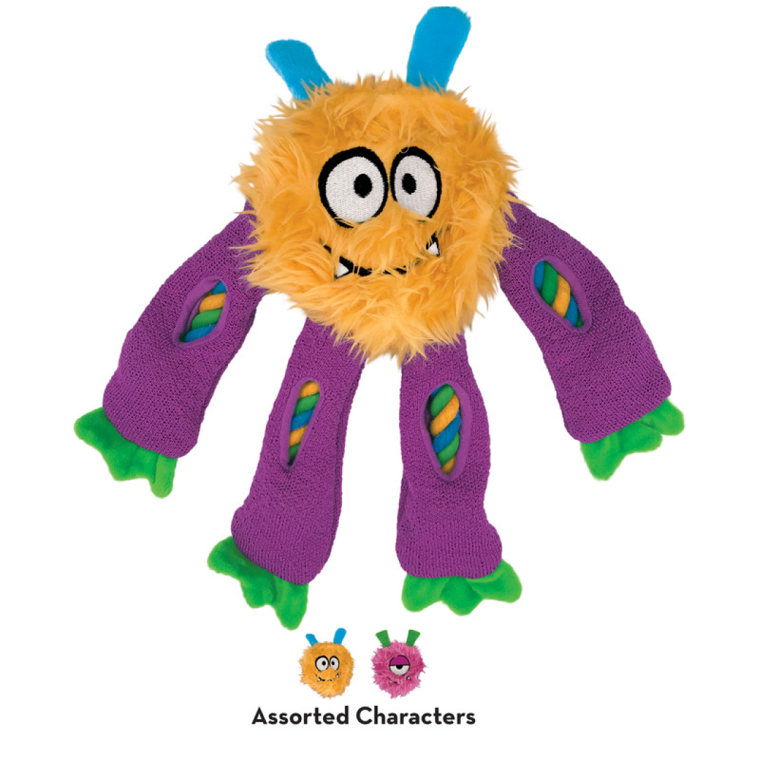 Das robuste Innenseil von Sneakerz Knots verfügt über einen Seilknoten im Kopf, der sich durch die Beine erstreckt und einen Ausgang für ein angemessenes Kauverhalten bietet. Einzigartige Guck-Guck-Fenster wecken die Neugier und erweitern die Beschäftigung mit dem Futtersuchspaß. Lange, baumelnde Beine eignen sich hervorragend zum Schüttelspiel und die Beine aus griffigem Tennisschuhmaterial quietschen für jede Menge interaktives Zerren mit diesen grinsenden Kumpels.