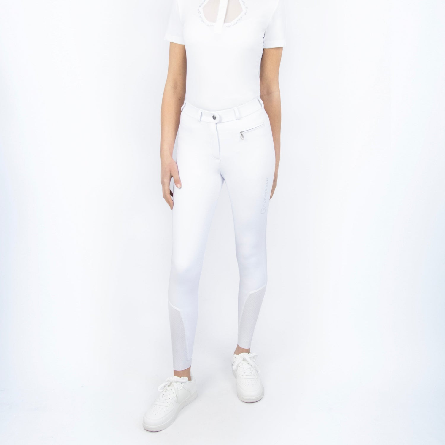 The stunning Coldstream Eckford Crystal Breeches are a timeless must-have for equestrians who seek glamourous yet technical competition breeches, designed for the demands of top-level sport. Engineered from an eco-friendly innovative textile that is made from recycled plastic bottles. Each pair of breeches saves plastic bottles from going into landfill or the ocean. The sustainable technical quad-stretch material means these breeches allow for optimum flexibility, whilst promoting moisture wicking technology for unrivalled comfort. The expertly crafted fabric also offers 50+ UV Block protection, protecting your skin from the sun’s harmful rays, whilst also offering water resistant properties to ensure you stay dry whilst competing in inclement weather. A tailored look is achieved by the ruffled pleat design to the back of the breeches. This offers a sculpted, flattering and feminine fit that feels like a close contact, second skin feel to make you feel empowered whilst in the saddle. Elegant silver diamantes feature on the right leg and to the rear belt loop to form the Coldstream emblem for a sparkly stylish touch, whilst the two rear pockets are lined by silver crystal fabric create an attractive glimmery finish. Airflow is optimised by the technical mesh sock which further assist with breathability and creating the perfect fit under long boots. Silicone non-slip detailing features innovatively on the inside of the waistband, which assists with keeping your show shirt neatly in place when tucked in. Advanced silicone CS-grip system features as a full seat in a smart hexagonal pattern to offer stability and security when you need it most. Finished with a front zip pocket with hexagonal zip pull and silver Coldstream gutos fastening.
