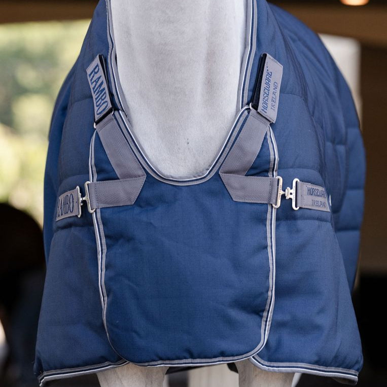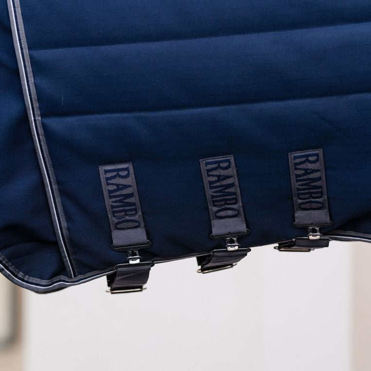 Horseware Ireland Rambo Optimo 400g Plus Stable Rug - Navy/Thunderstorm Grey/Silver / 5'6 ist auf Lager und wird versandt, sobald es wieder verfügbar ist
