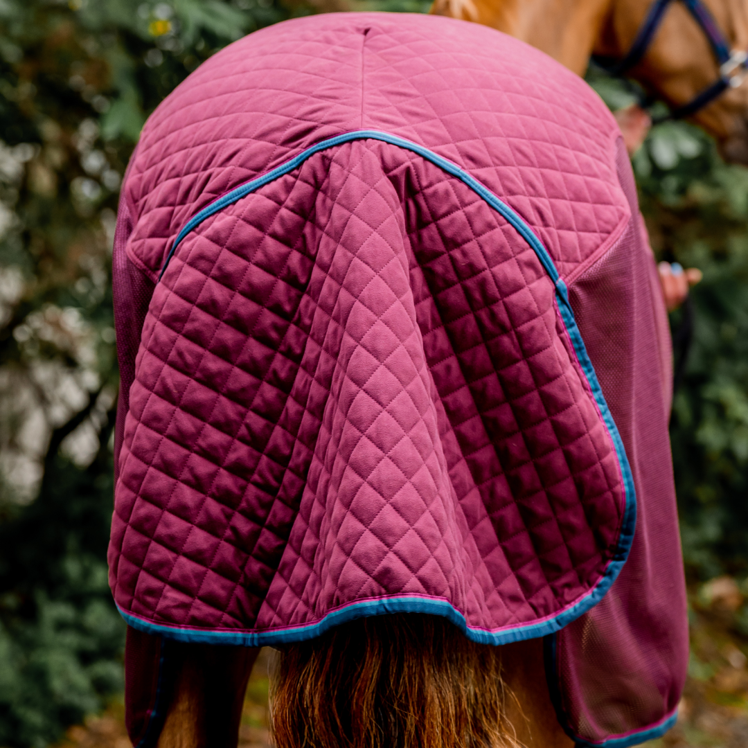 Perforierte Netzseiten ermöglichen eine maximale Luftzirkulation, um Überhitzung zu vermeiden. Zu den weiteren Details der Travel-Serie gehört ein glanzverstärkendes Futter an den Schultern und am großzügigen, extrabreiten Schweiflatz. Ein gerader Vorderverschluss aus Leder sorgt für ein elegantes Aussehen und hält die Decke in Kombination mit der abwischbaren Schweifkordel sicher und an Ort und Stelle