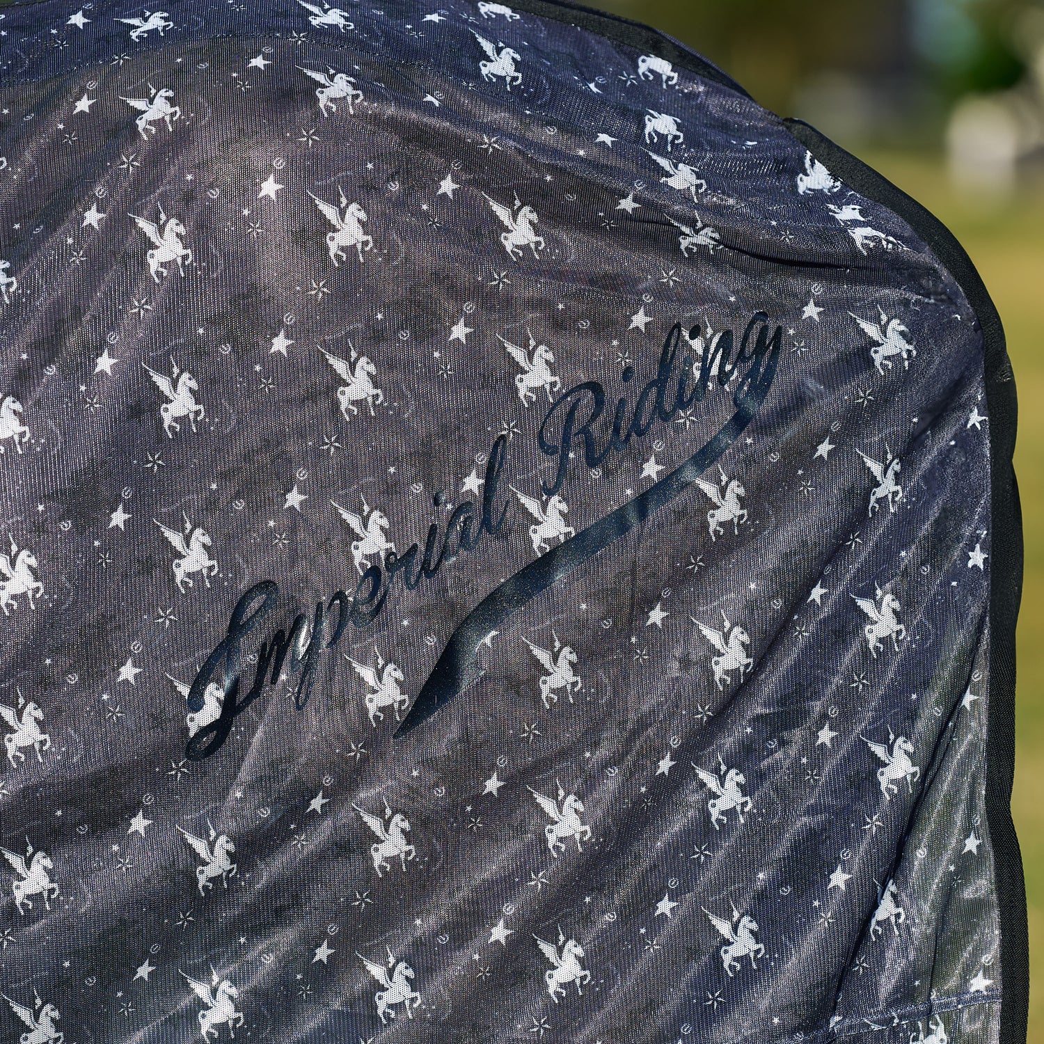 The flyblanket is made of fine mesh in IR designed prints.The blanket protects the horse against mosquitoes and flies and prevents the horse being discolored by the sun. With nylon lining on the shoulder and the manes, gusset and chest closure with velcro and buckle closure. The adjustable belly flap has three torque fasteners. Furthermore, the blanket has an extra long tail flap with tailstrap and elastic leg straps. TIP! Did you know that especially this funny print keeps the flies away? They even get drunk by the effect of the print.