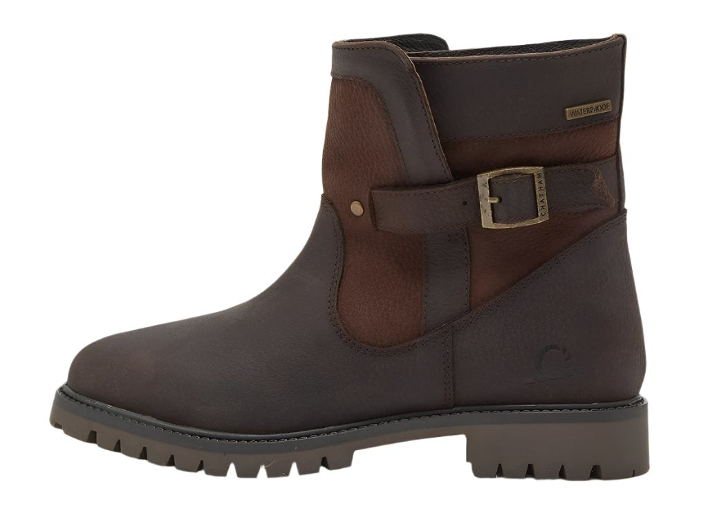 Made using a stylish blend of waterproof premium leather in smooth and grained finishes in rich dark brown, these women's ankle boots are a pull-on style with buckle detail, Chatham logo and a 100% waterproof breathable fabric lining. They have the Chatham sole spring poron performance cushioning, which is anti-bacterial and offers maximum comfort and shock absorption, and they sit on a heavy duty rubber sole.