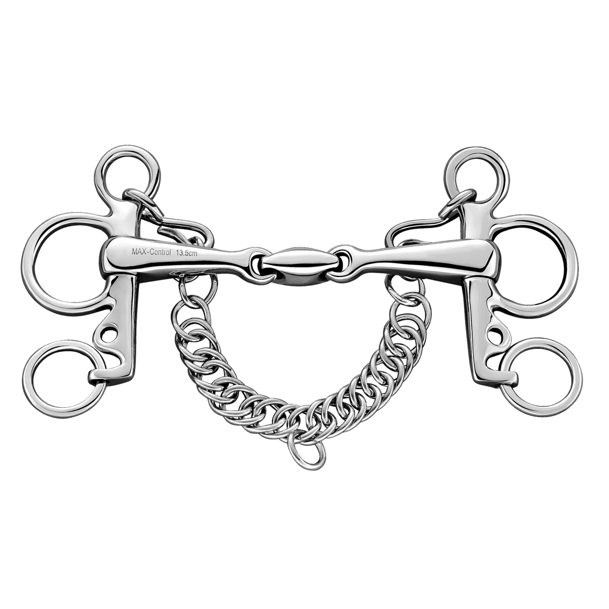 The MAX-Control Pelham is double jointed and can develop a bar effect when the reins are taken up. It enables targeted and effective aids to be given, which act on the tongue, poll and the lower jaw. Depending on the buckling, the leverage effect on the neck can be varied as desired. This gives you the opportunity to respond individually to your horse.
