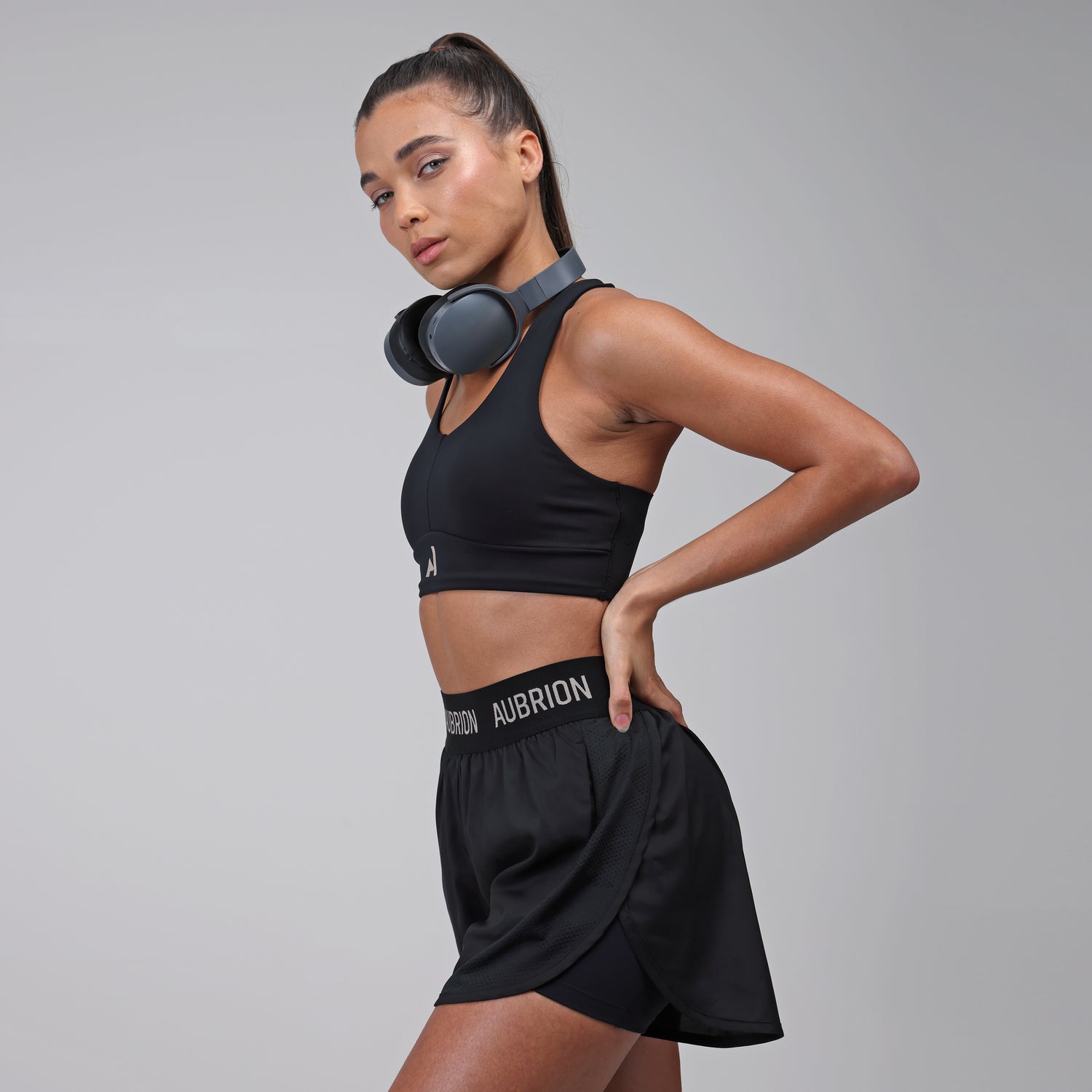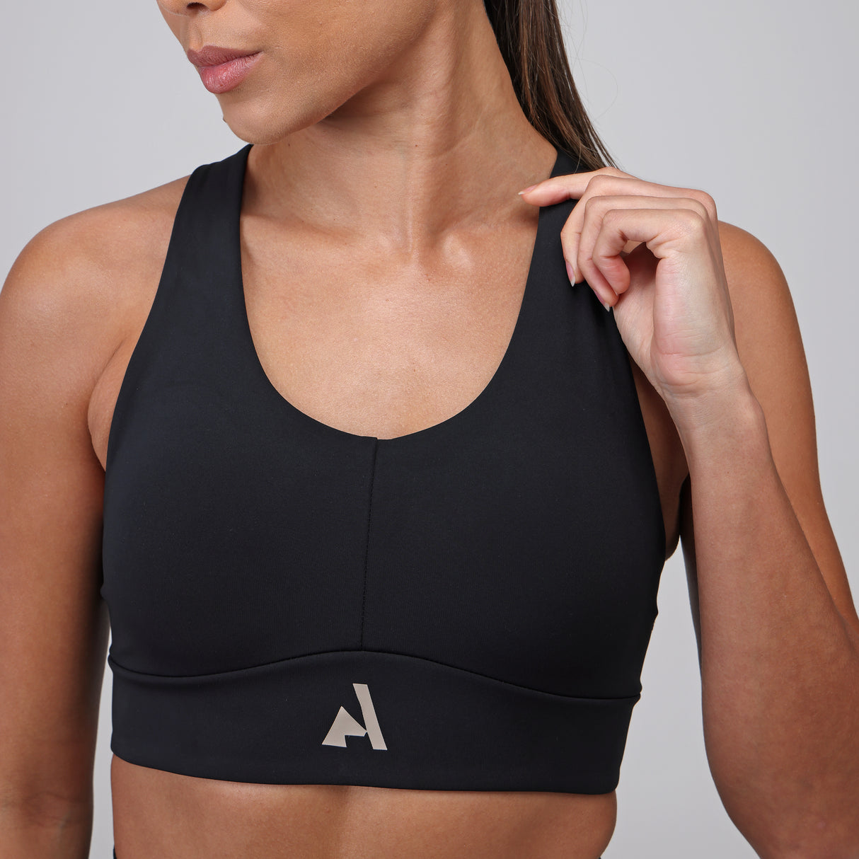 Supportive double-layer cups allow the use of moulded inserts for a custom fit, while a centre seam gives a contoured effect. The layered underband system offers performance support without restricting movement. Overlocked stitching ensures bulk-free flat seams to prevent chafing.