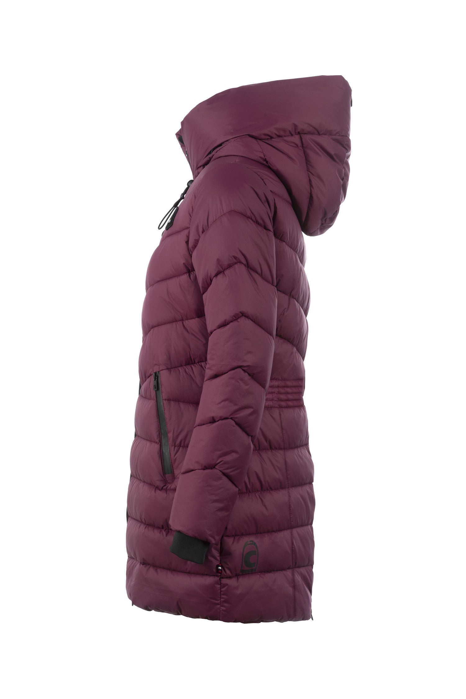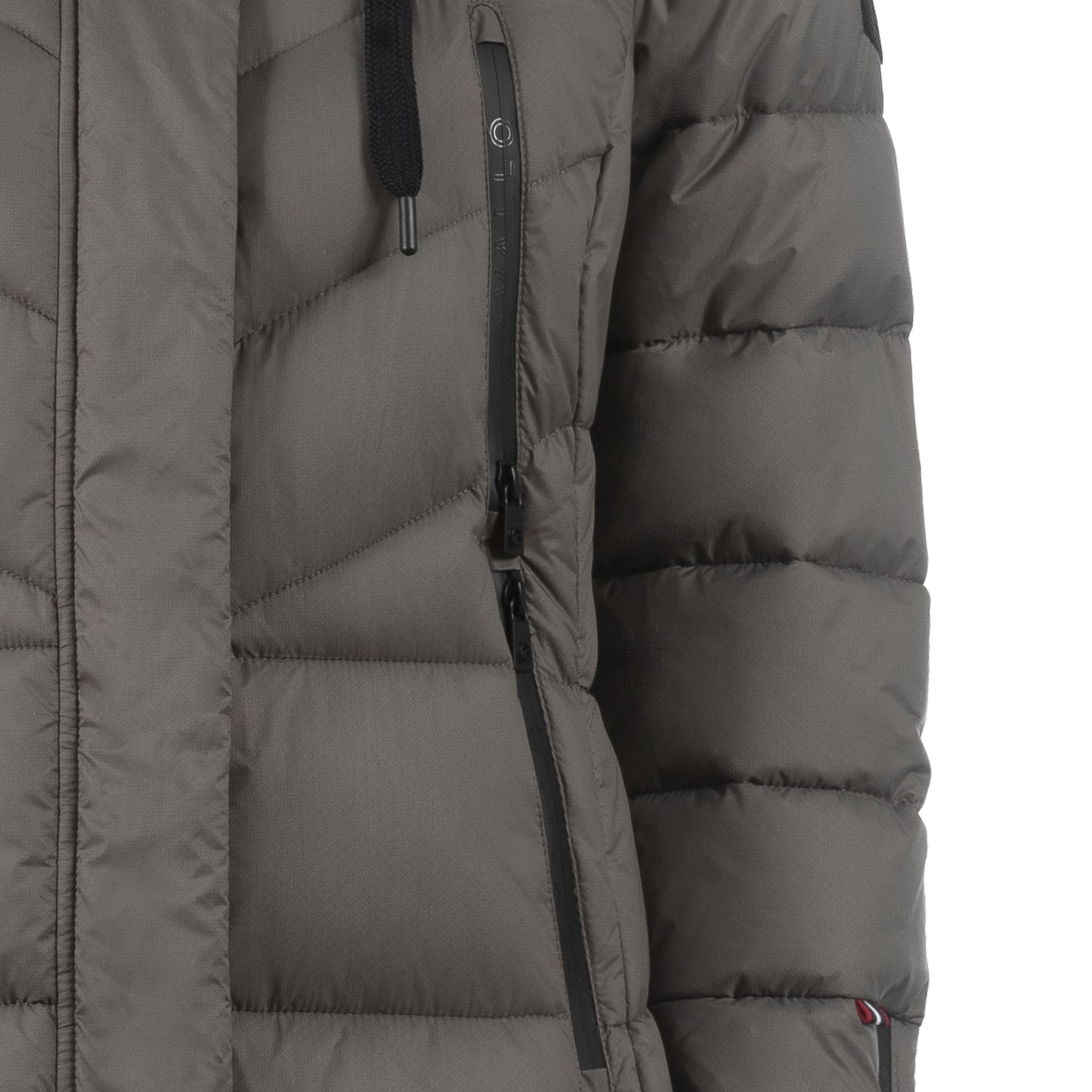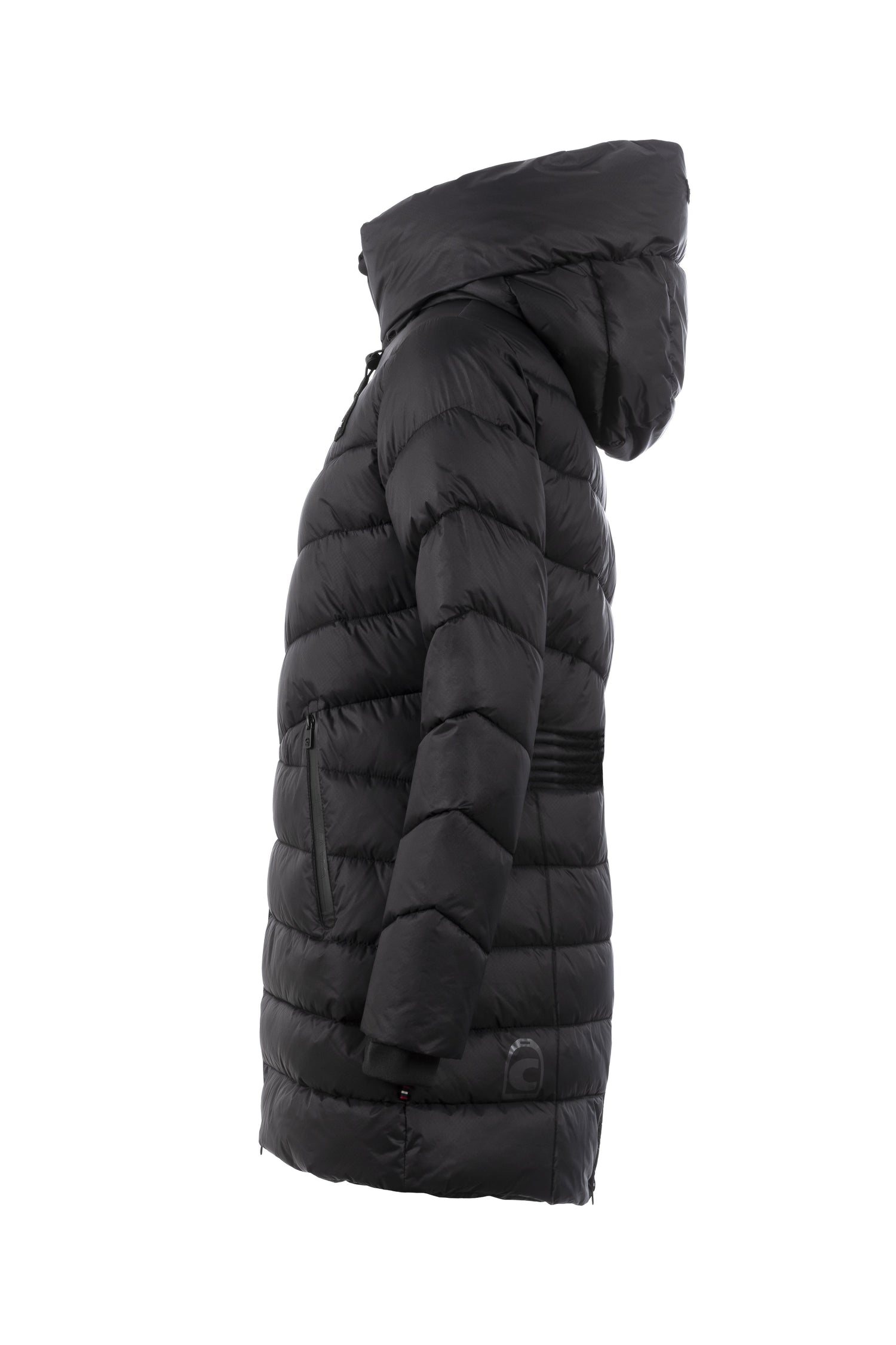 The Cavallo Maya Functional Parka features a sleek, fitted design with a large hood and high-quality label. The hood is adorned with a black drawstring and delicate white print, fastened at the back with a snap. The jacket has diagonal quilting on the upper body and horizontal quilting on the lower body, giving it a unique look.