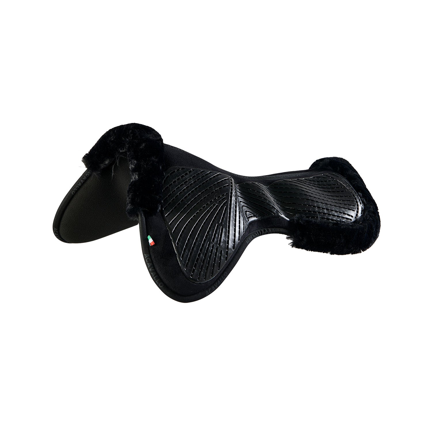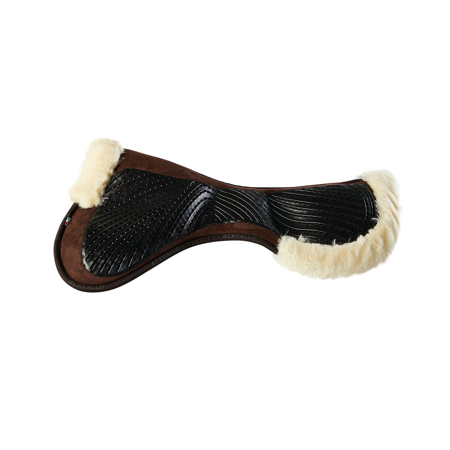 The Acavallo® flat pad in memory foam jumping close contact shape in suede and cut-out faux sheepskin with gel grip is an exceptional solution that combines the performance of Acavallo® gel and memory foam technology, offering your horse a superior riding experience in terms of comfort and safety.