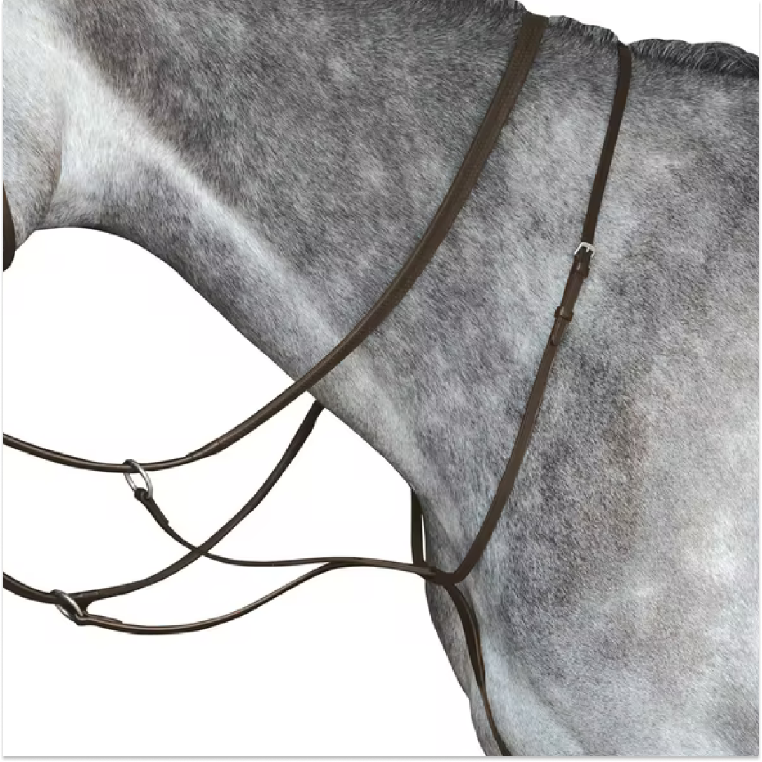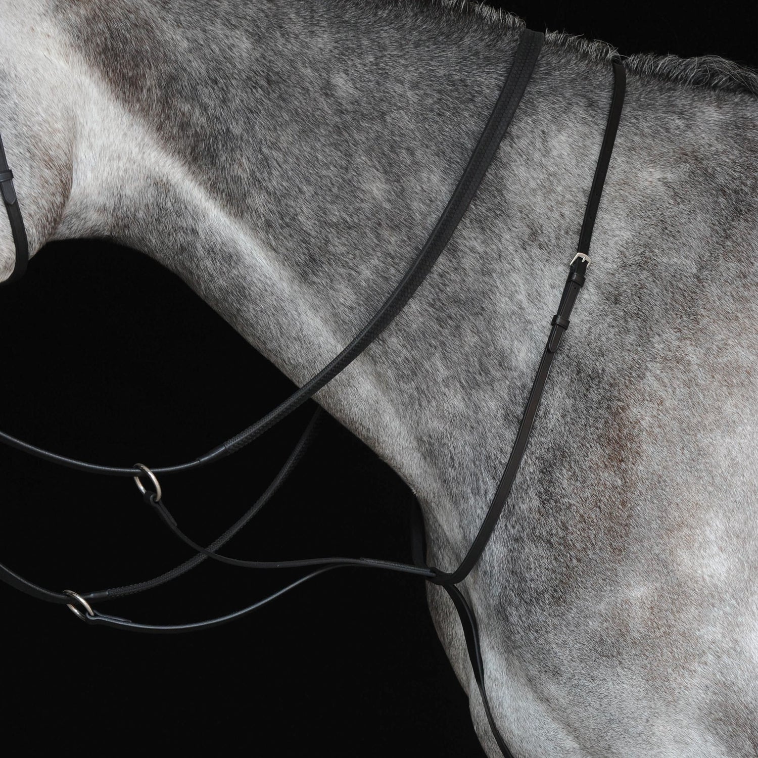 - La martingale courante se divise en deux sangles à partir de la sangle de cou avec un anneau en acier inoxydable sur chacune pour que les rênes puissent passer facilement.