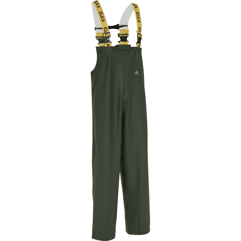 ELKA Rainwear Dry Zone PU Bib & Brace – the perfect combination of functionality and comfort in waterproof workwear. This bib & brace is part of ELKA Rainwear's Dry Zone series, known for its durable and flexible rainwear designed for demanding work environments. With a focus on durability and comfort, this bib & brace is ideal for those who need reliable workwear that protects against both rain and wear. The Dry Zone PU Bib & Brace is equipped with adjustable ELKA suspenders with Fix-lock buckles, ensuring a perfect fit that easily adapts to your body. The suspenders keep the bib & brace securely in place, providing freedom of movement throughout the workday. For added durability, especially in high-stress areas, the trousers feature reinforced welding at the crotch, making them resistant to wear and tear in even the toughest work conditions. Additionally, the legs are fitted with press buttons, allowing for a snug fit around boots, offering maximum protection. These bib & brace trousers from ELKA Rainwear are the ideal choice for professionals needing waterproof and windproof work trousers. They ensure that you stay dry and comfortable in the most challenging weather conditions, whether working outdoors in the rain or in wet environments.