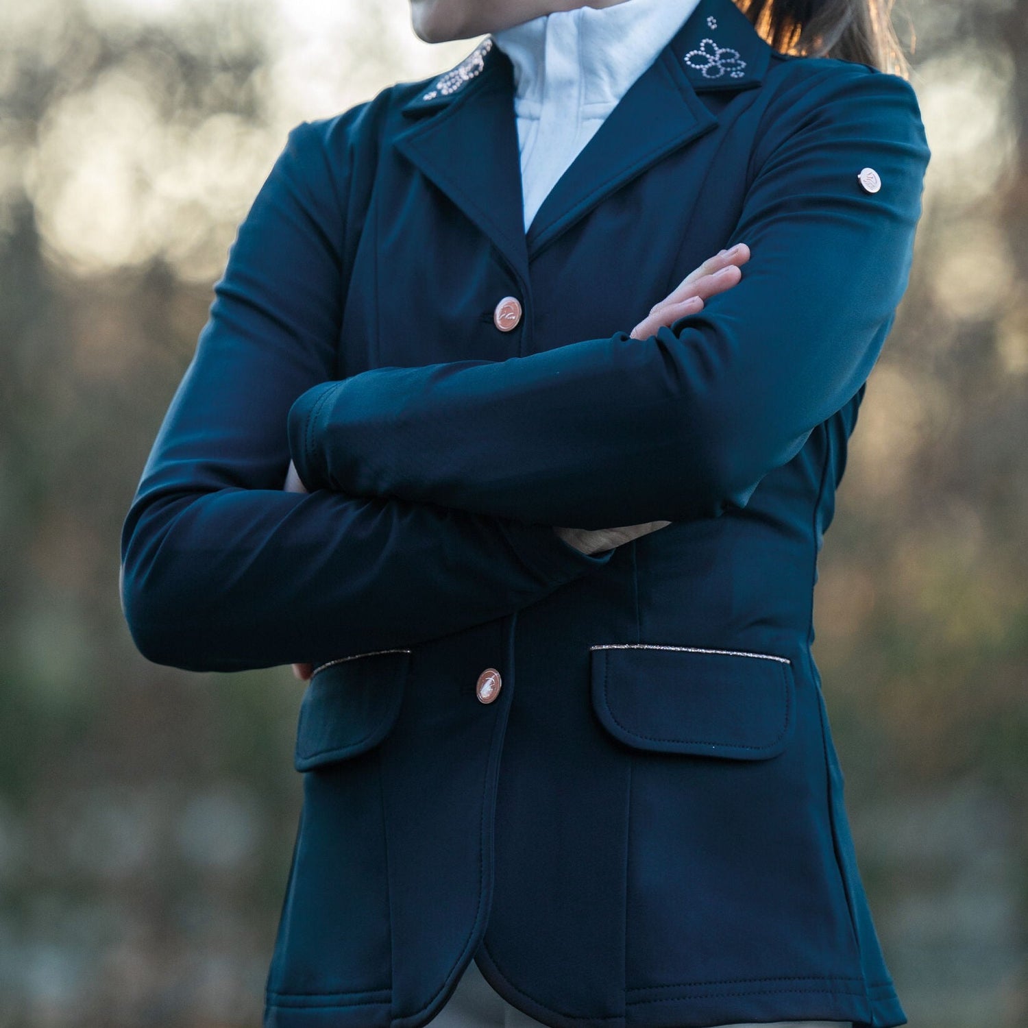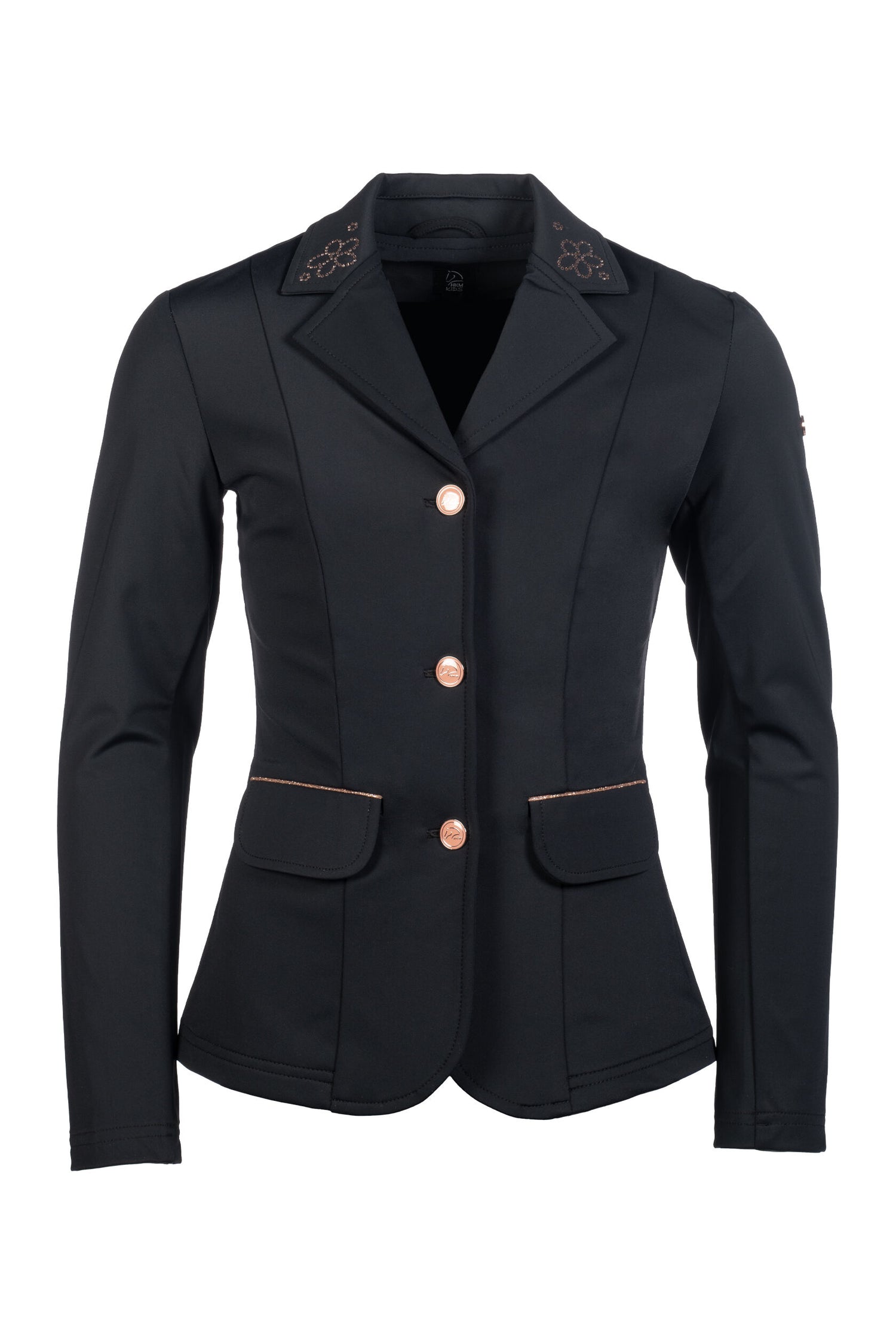 The HKM Flora Kids competition jacket ensures that young riders look elegant at the riding tournament. It has a slightly tailored cut and closes with a zipper, which is hidden by a button placket.