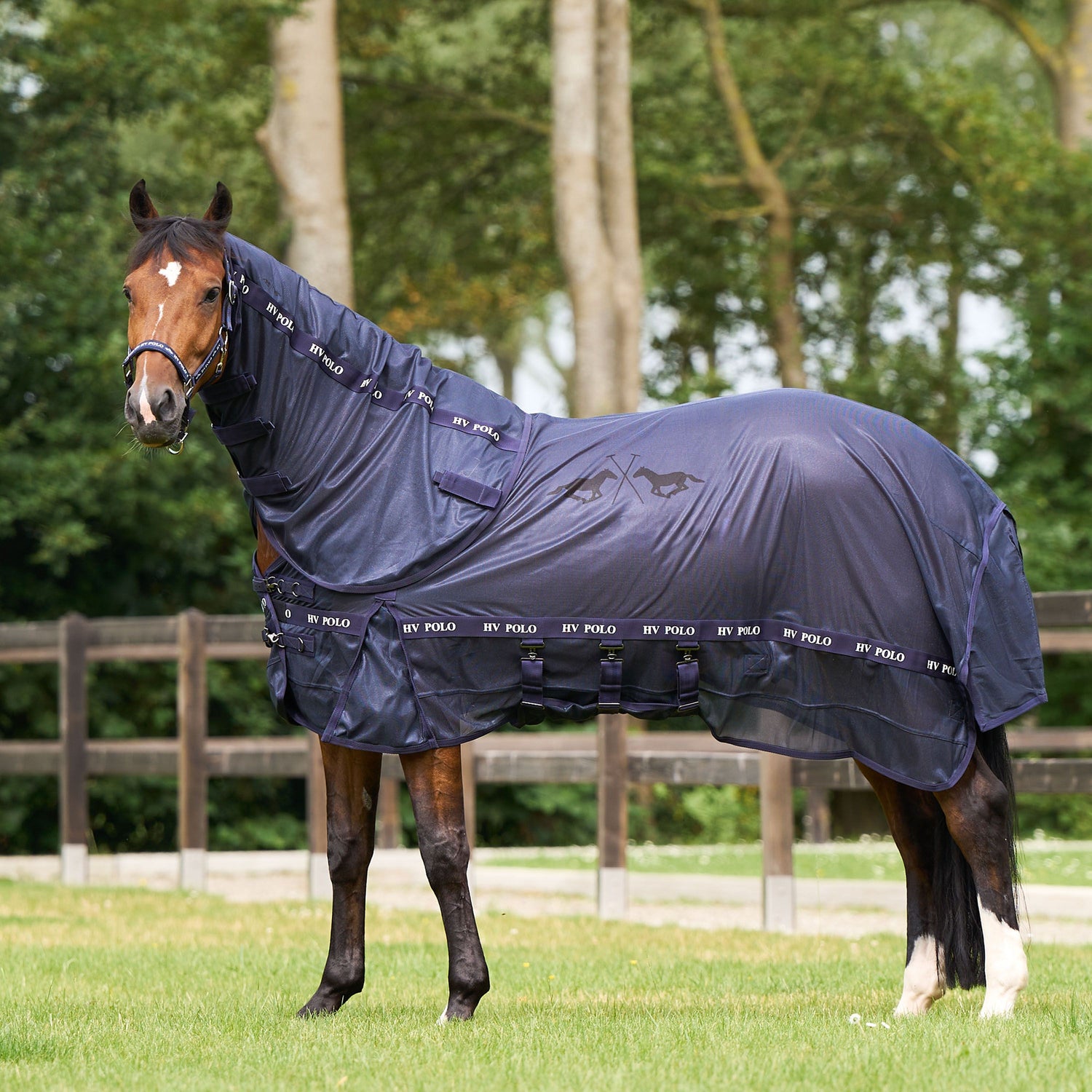 Protect your horse from pesky insects with the HV Polo Nena Fly Blanket. Equipped with a detachable neck and belly flap, this mesh blanket provides comprehensive coverage. The logo print and tape add a touch of style to functionality, keeping your horse comfortable and fly-free in warm weather.
