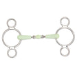 Ce bâillon à deux anneaux permet de déplacer la rêne, augmentant ainsi l'effet de levier si nécessaire. La cacahuète garantit que l'embout buccal n'entrera pas en contact avec le palais lorsqu'il est en action, ce qui le rend plus confortable.