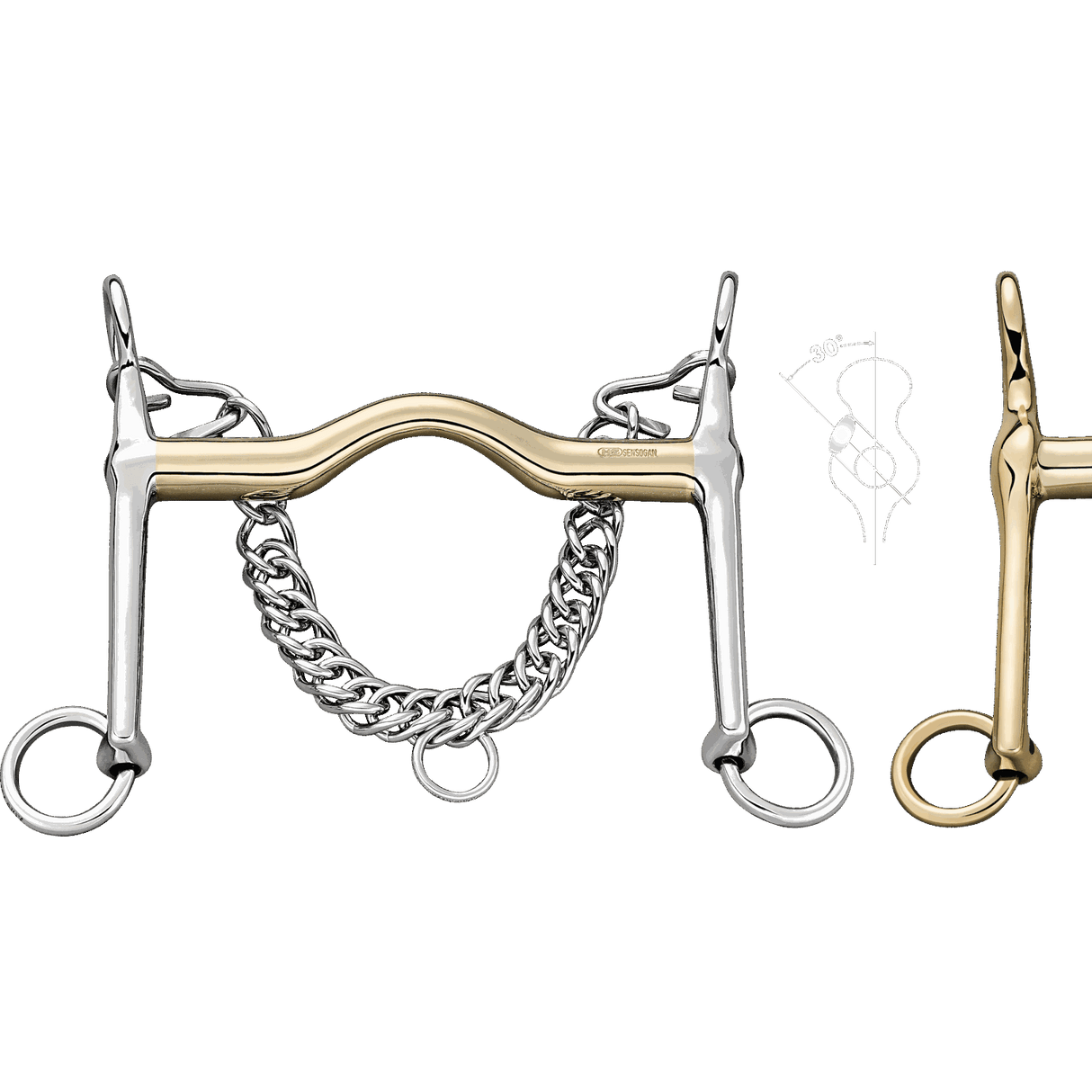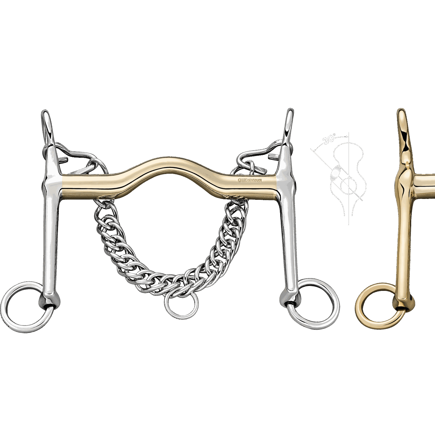 The Weymouth is attached a little bit lower where the horse's head gets thinner. Therefore the Weymouth should be 1/2 to 1 cm smaller than the bradoon. It is important that the cheeks of the Weymouth fit closely to both sides of the horse's mouth.