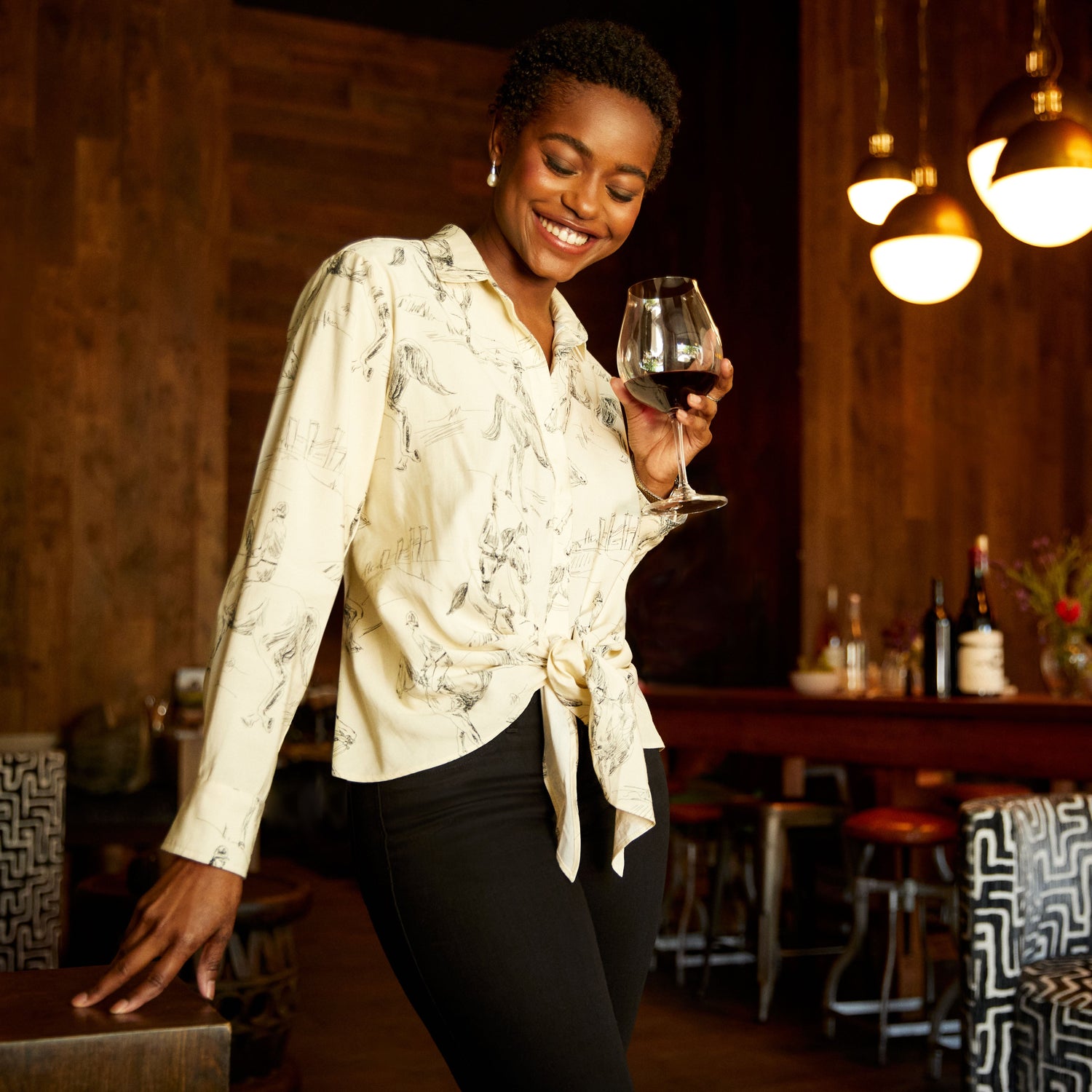 The Ariat Women's Larkspur Blouse offers a timeless and effortless style with its tied-front button-down design. It boasts a refined appearance with a discreet button placket and a waist-tie closure.