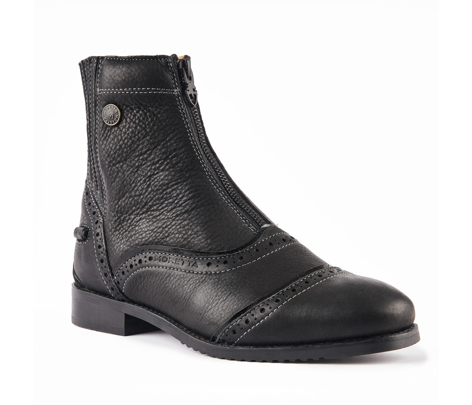 Premium paddock boots with brogue and patent detail. Moretta Martina paddock boots are crafted from full grain leather which is soft to touch. Fully leather lined. Fit enhancing rear stretch panels. YKK front zips. Leather grip spur rests. ActiveFlex insoles with Impact Support System. Moretta composite riding soles with steel shanks.